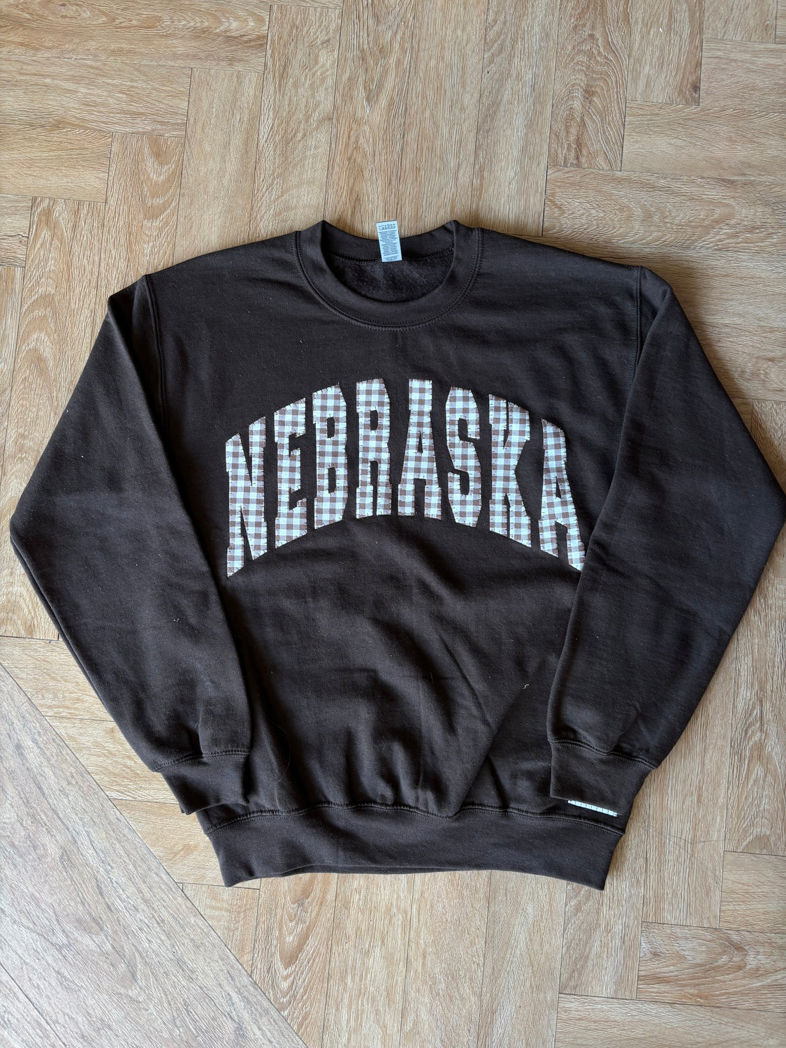 Add a touch of classic charm to your wardrobe with our Varsity Brown Gingham Nebraska Crew! This cozy brown sweatshirt features “NEBRASKA” in a playful brown gingham varsity patch design, giving it a timeless, preppy vibe. Each letter is carefully stitched for lasting durability and a one-of-a-kind, handcrafted feel.