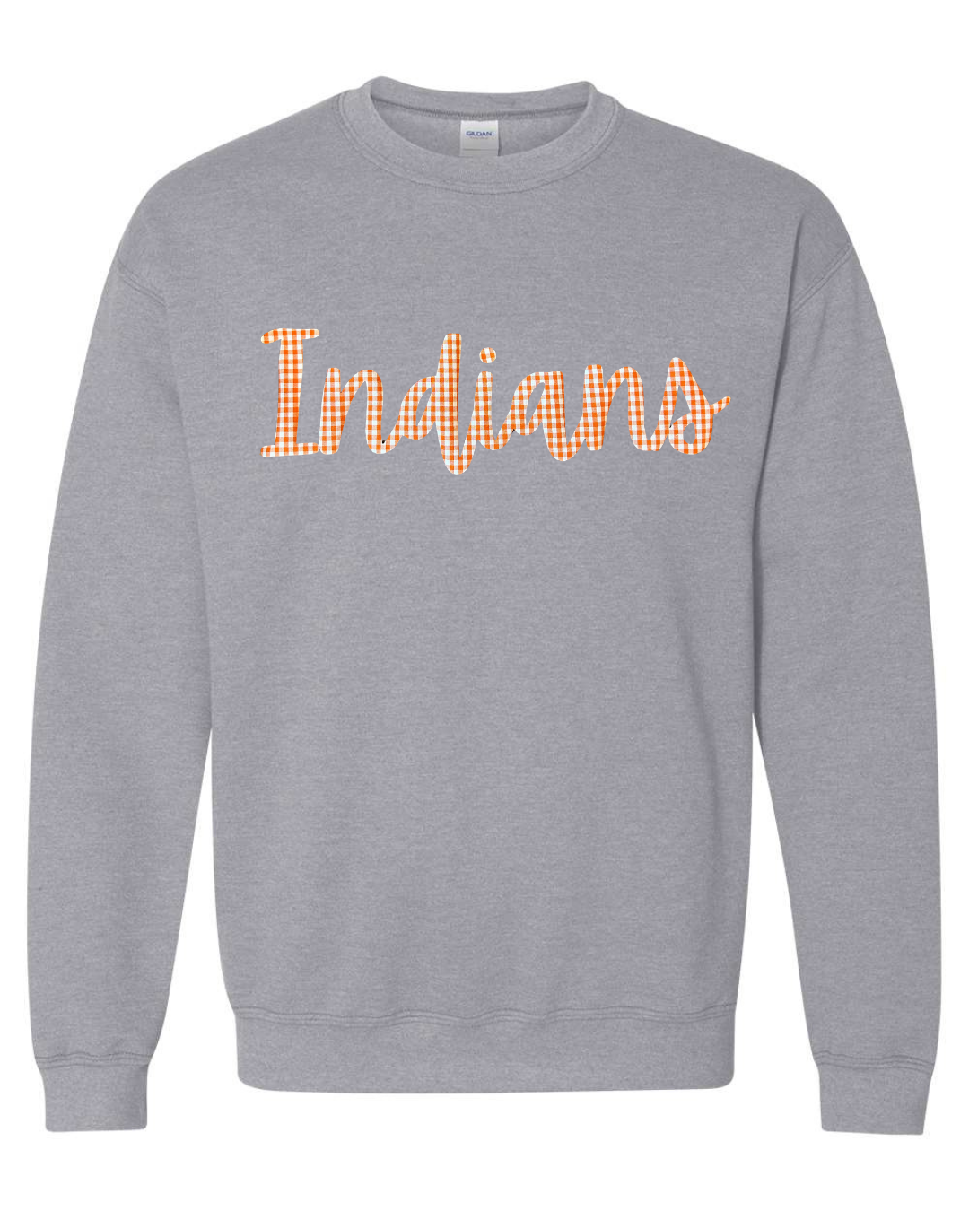 CURSIVE ORANGE/WHITE GINGHAM INDIANS - SPORT GREY GILDAN CREW - YOUTH + ADULT
