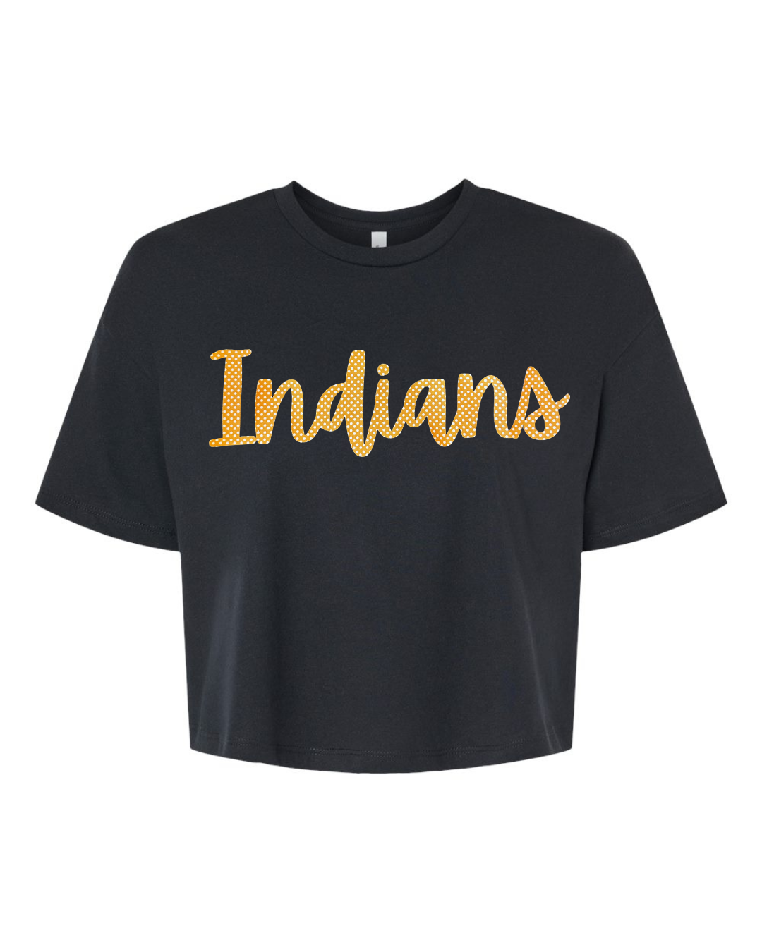 CURSIVE ORANGE/WHITE POLKA DOT INDIANS - BLACK CROP TEE