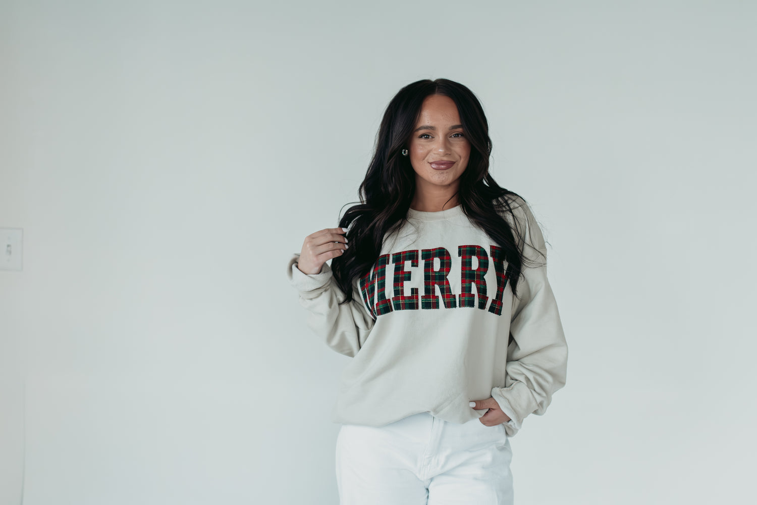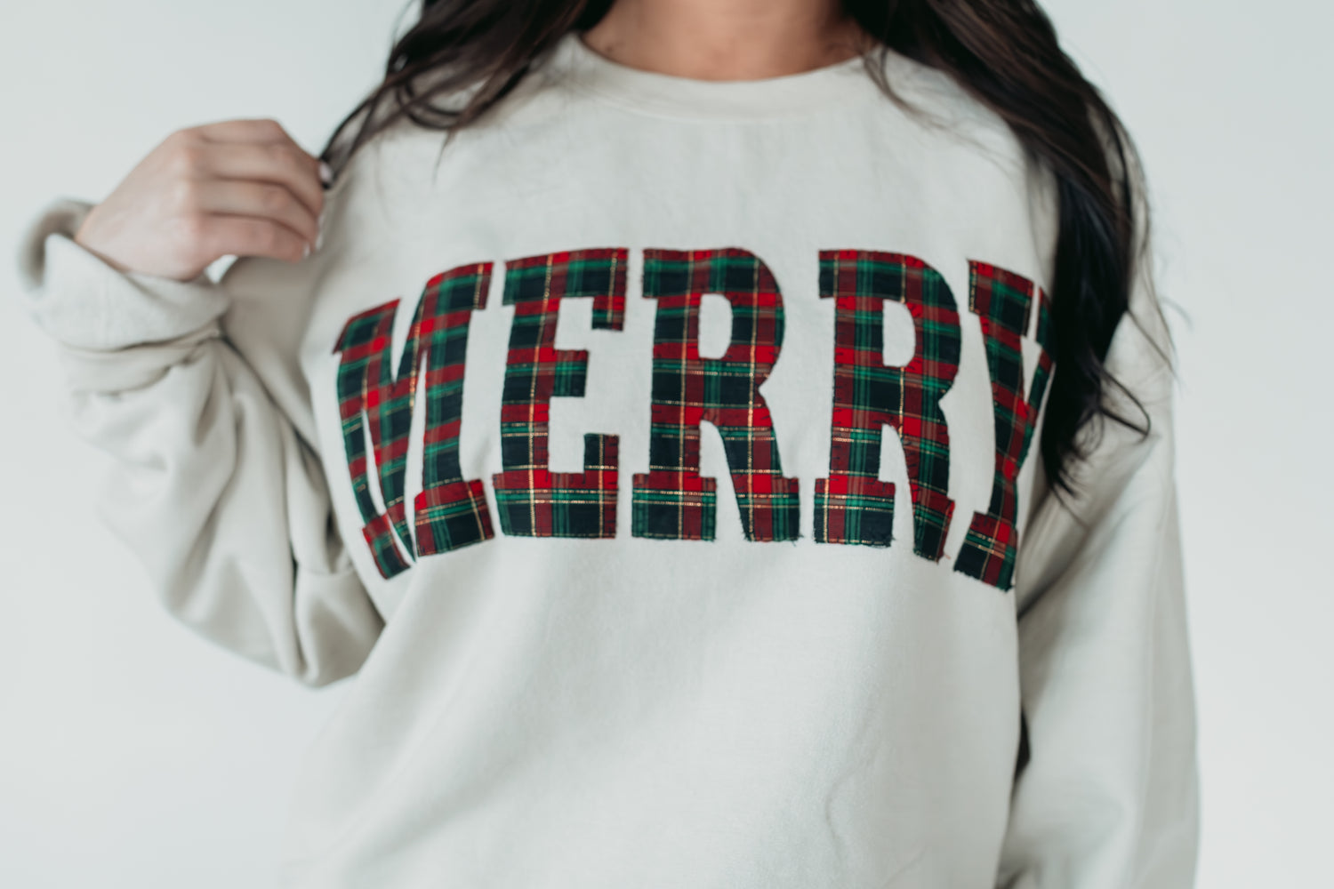 Cozy, festive, and full of holiday charm! Our sand-colored crewneck features a red and green flannel “Merry” appliqué—perfect for adding a classic Christmas touch to your holiday wardrobe. 🎄✨ Ideal for gift wrapping, tree decorating, or cozy nights by the fire!