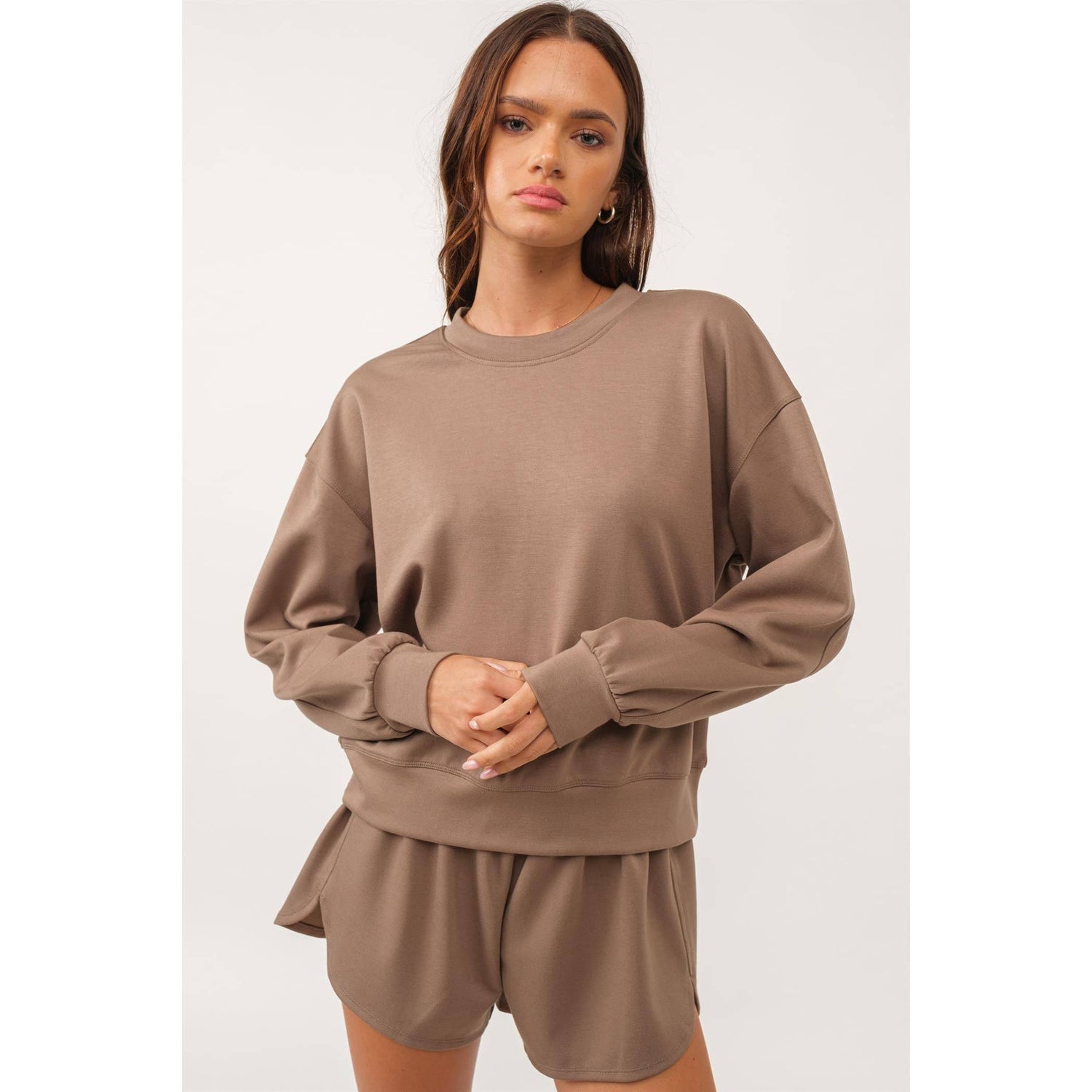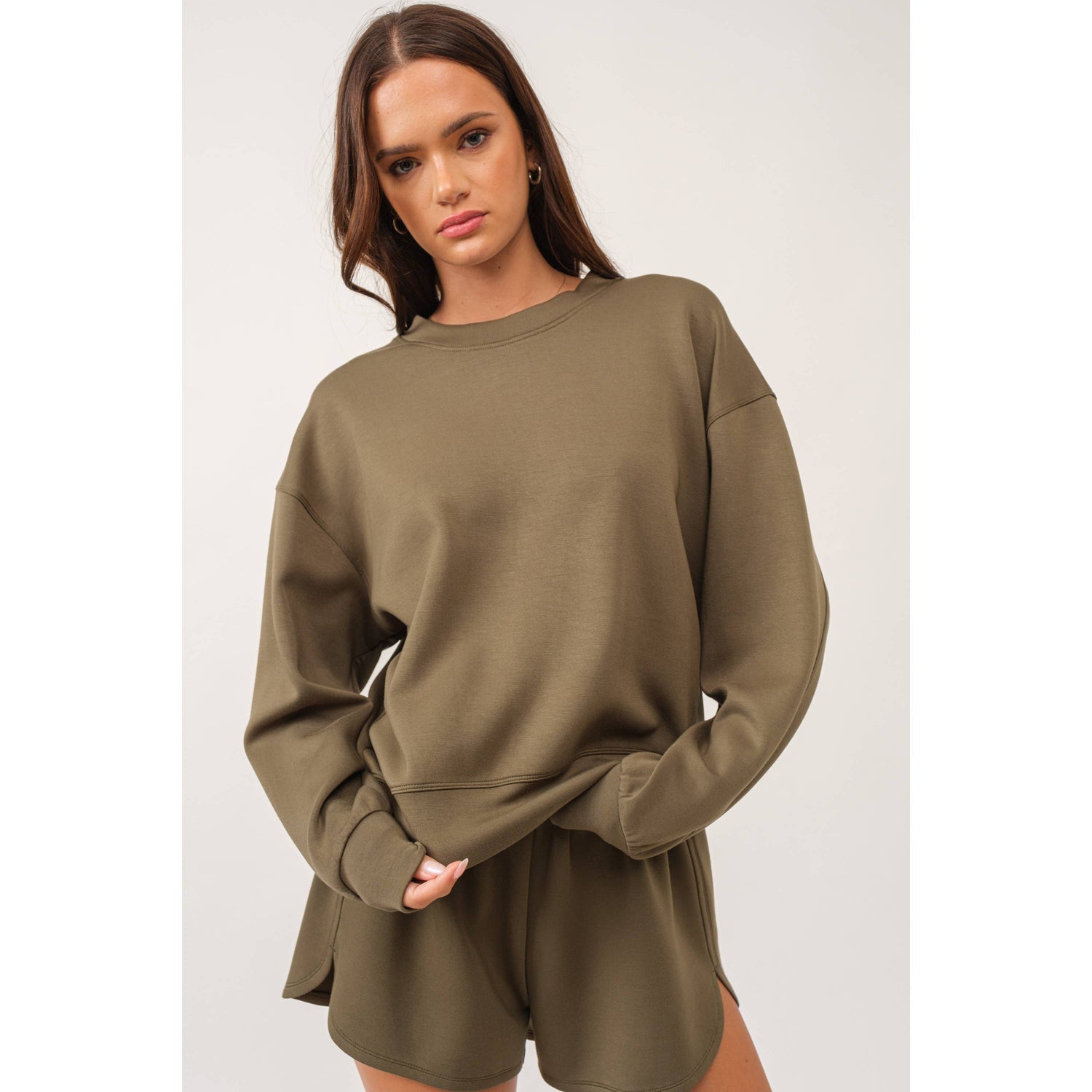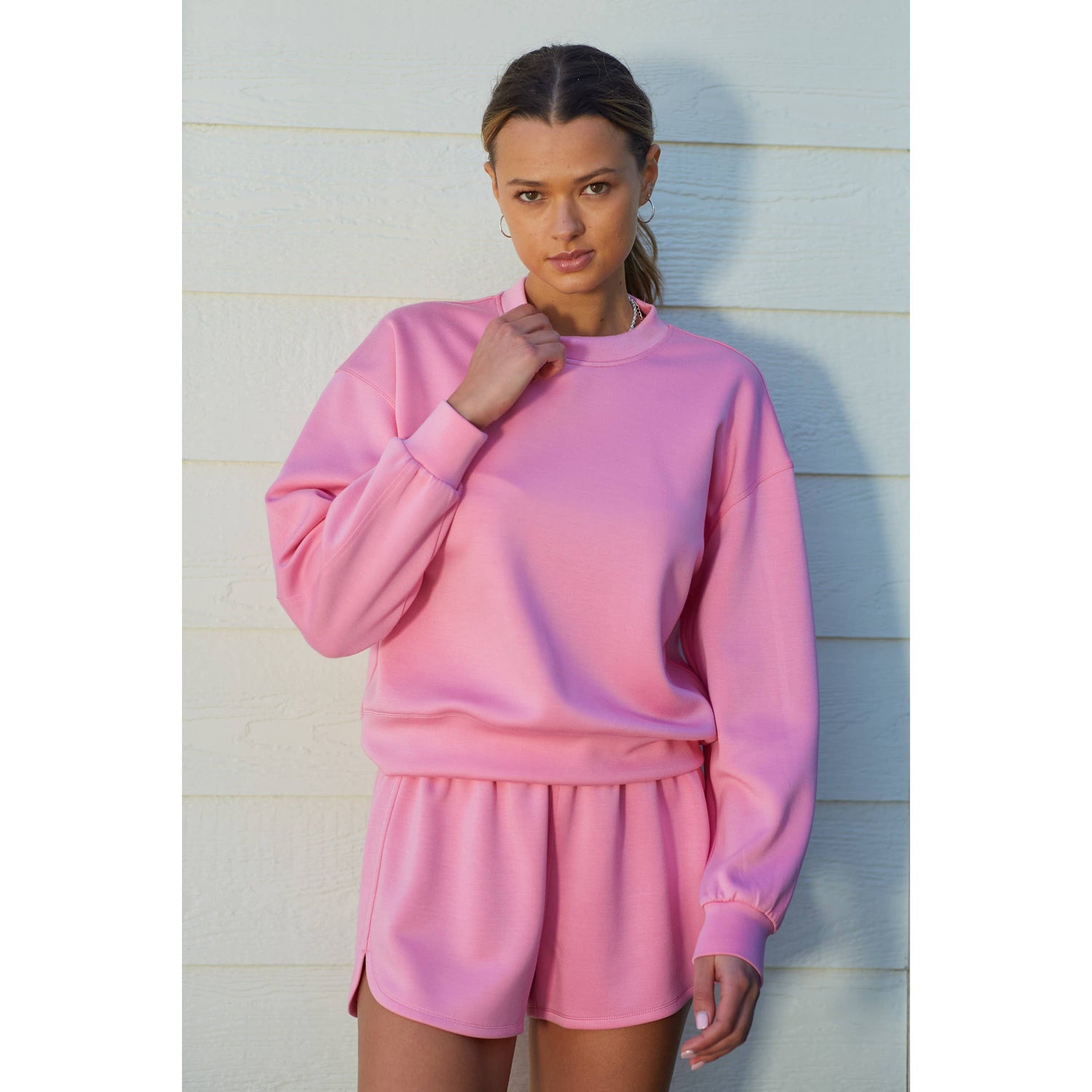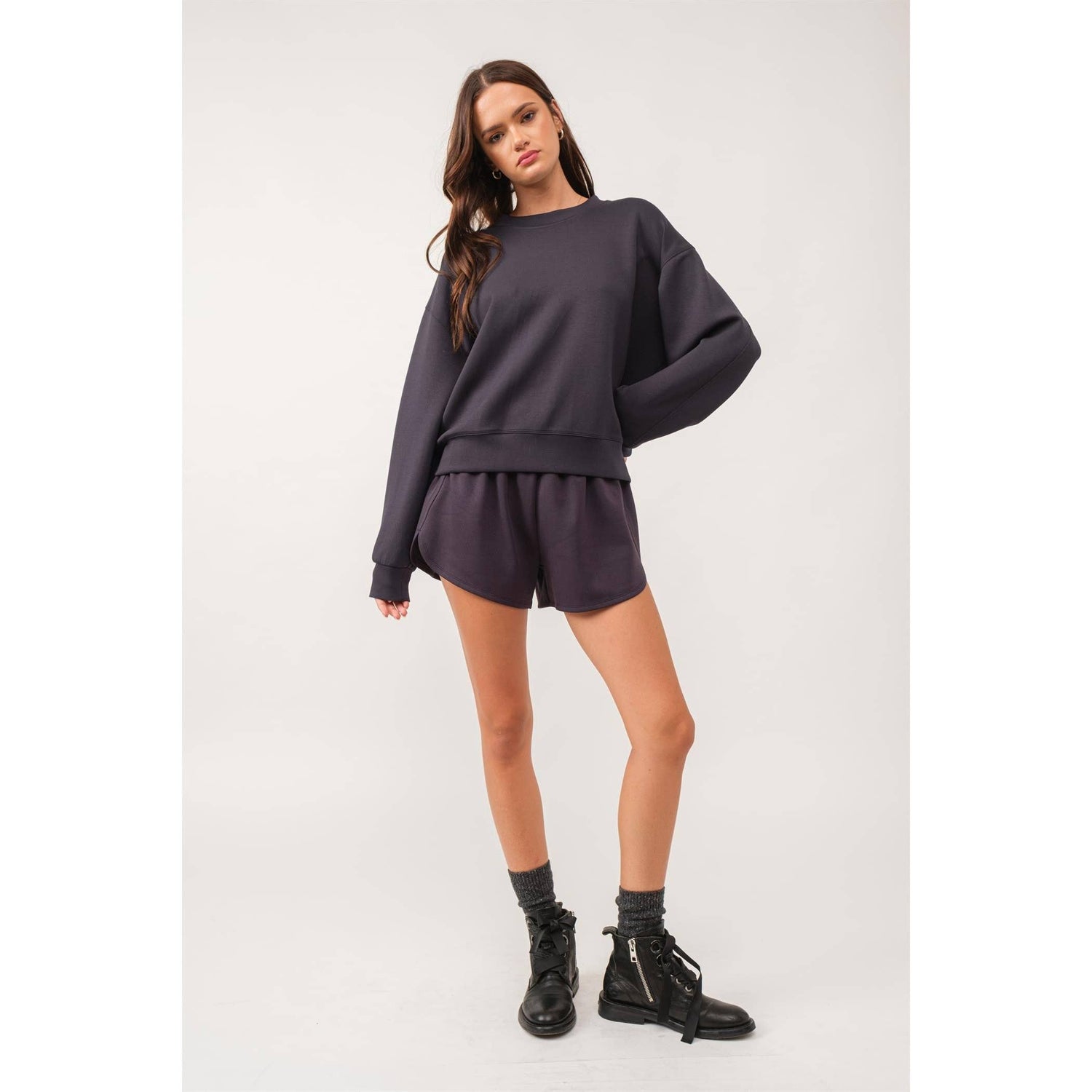 You can be confidently comfortable in our signature soft sweatshirt. This is made of light-weighted premium scuba. SIZE & FIT About 23" from HPS to hem Bust, about 24" 48% rayon 46% polyester 6% spandex