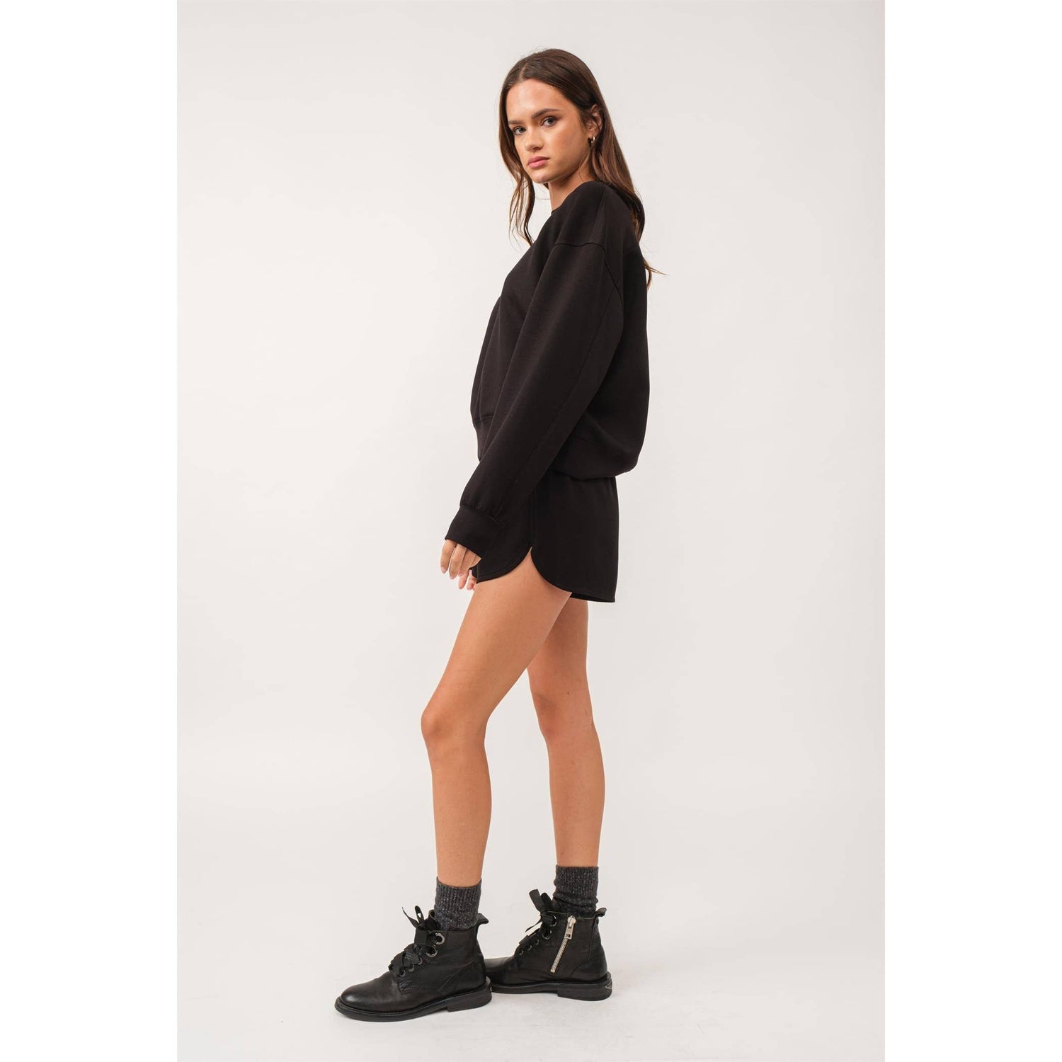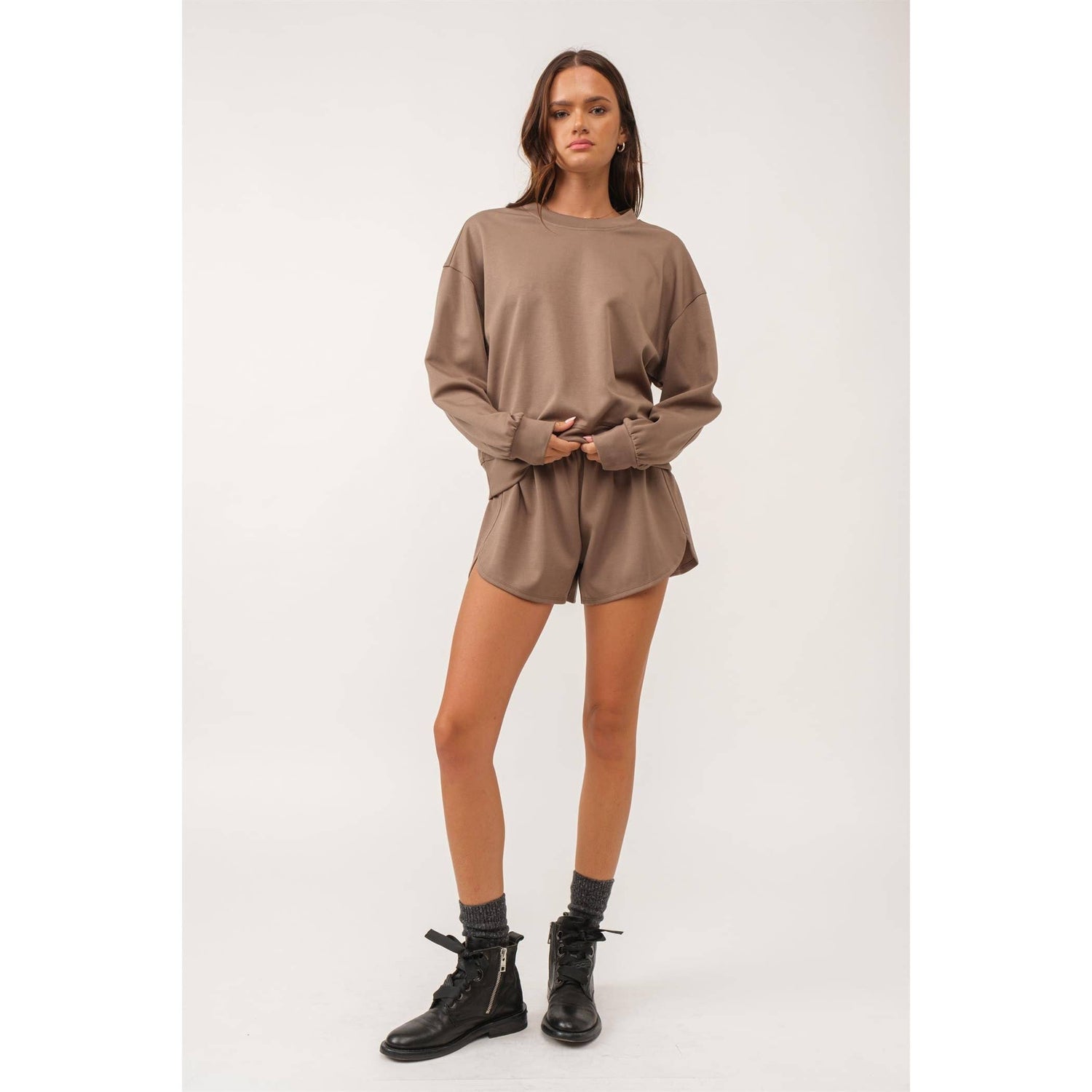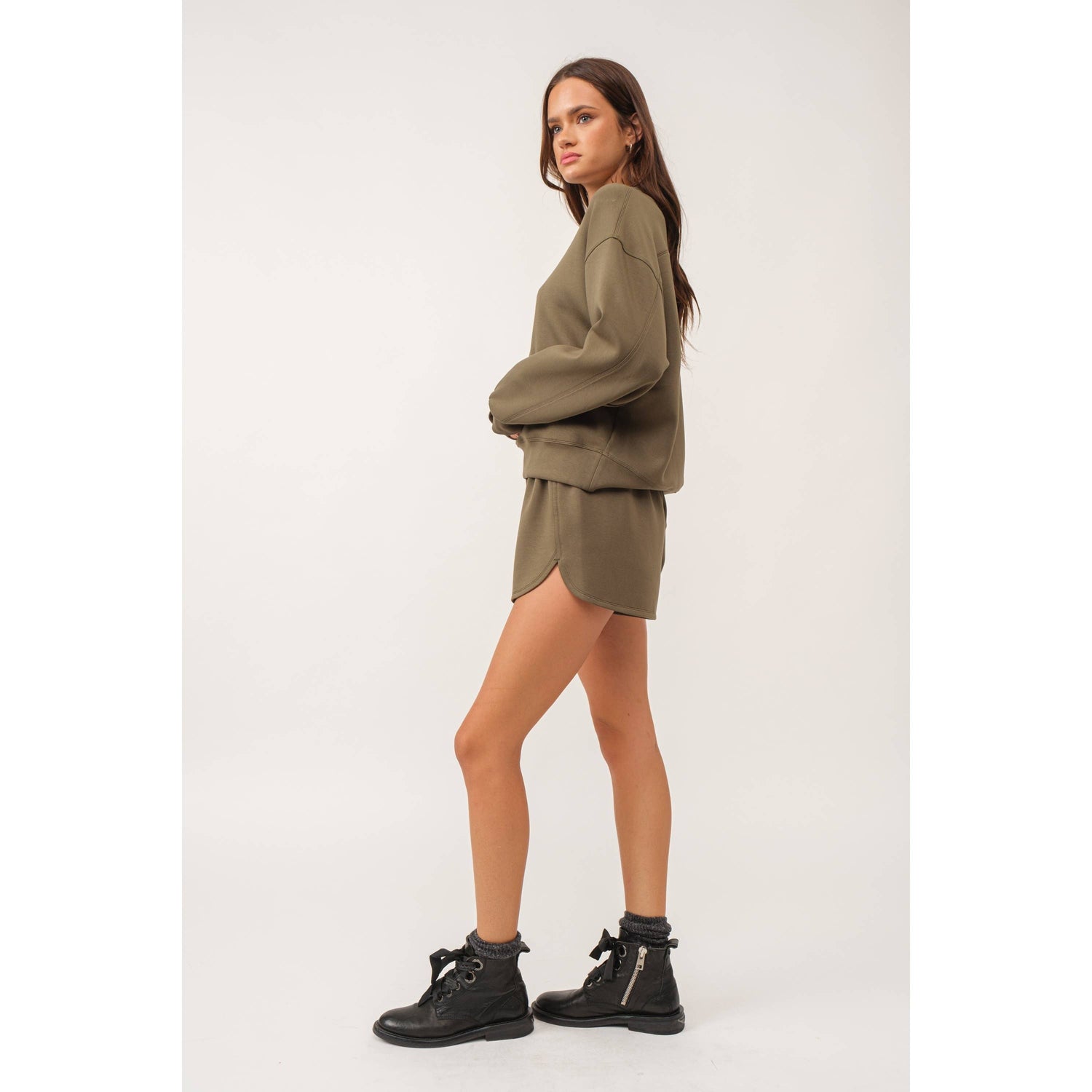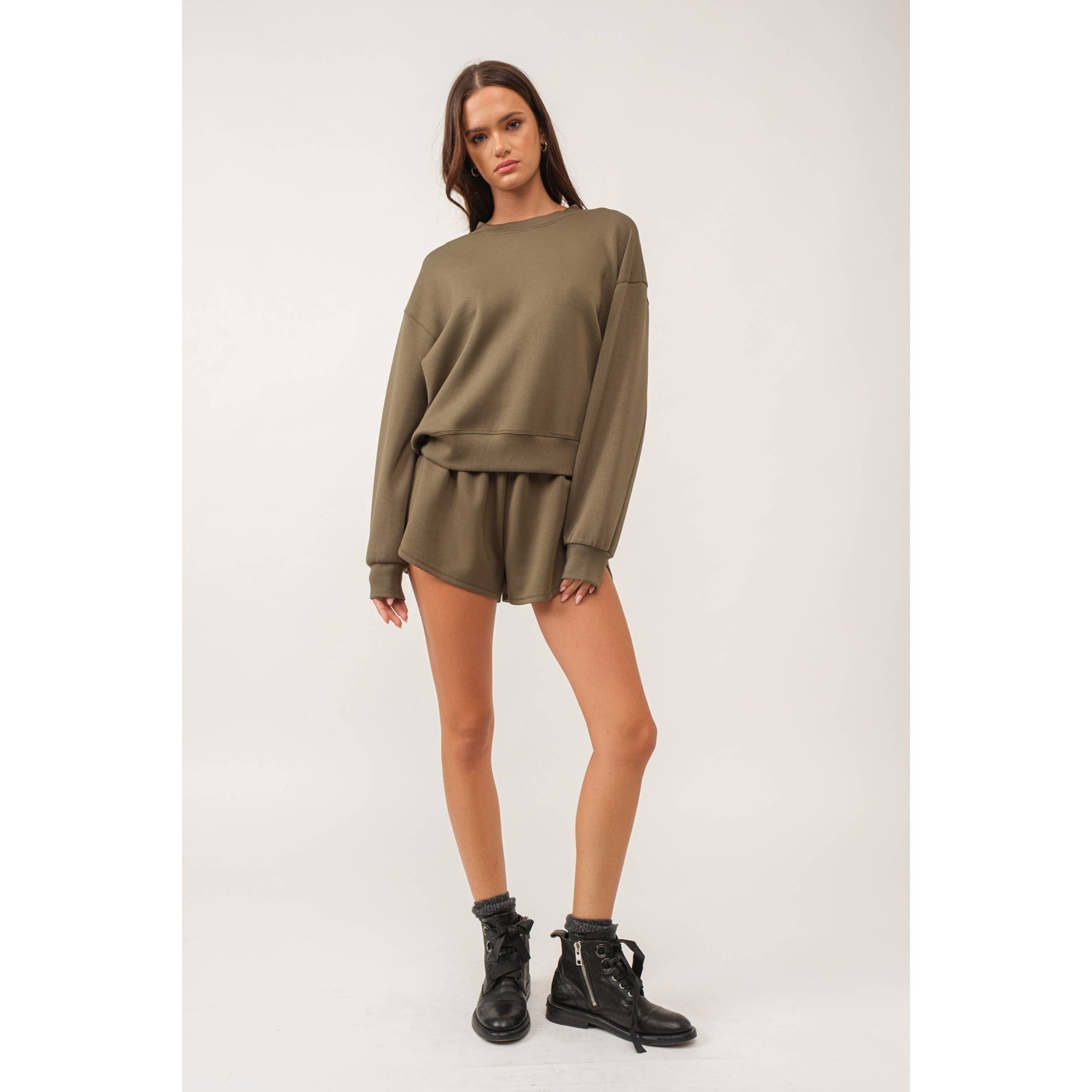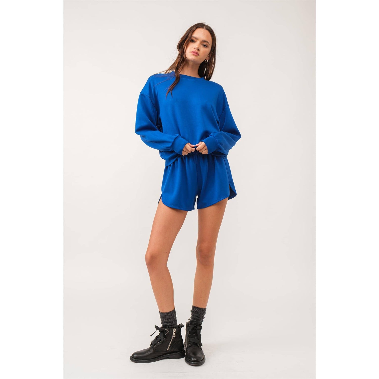 You can be confidently comfortable in our signature soft sweatshirt. This is made of light-weighted premium scuba. SIZE & FIT About 23" from HPS to hem Bust, about 24" 48% rayon 46% polyester 6% spandex