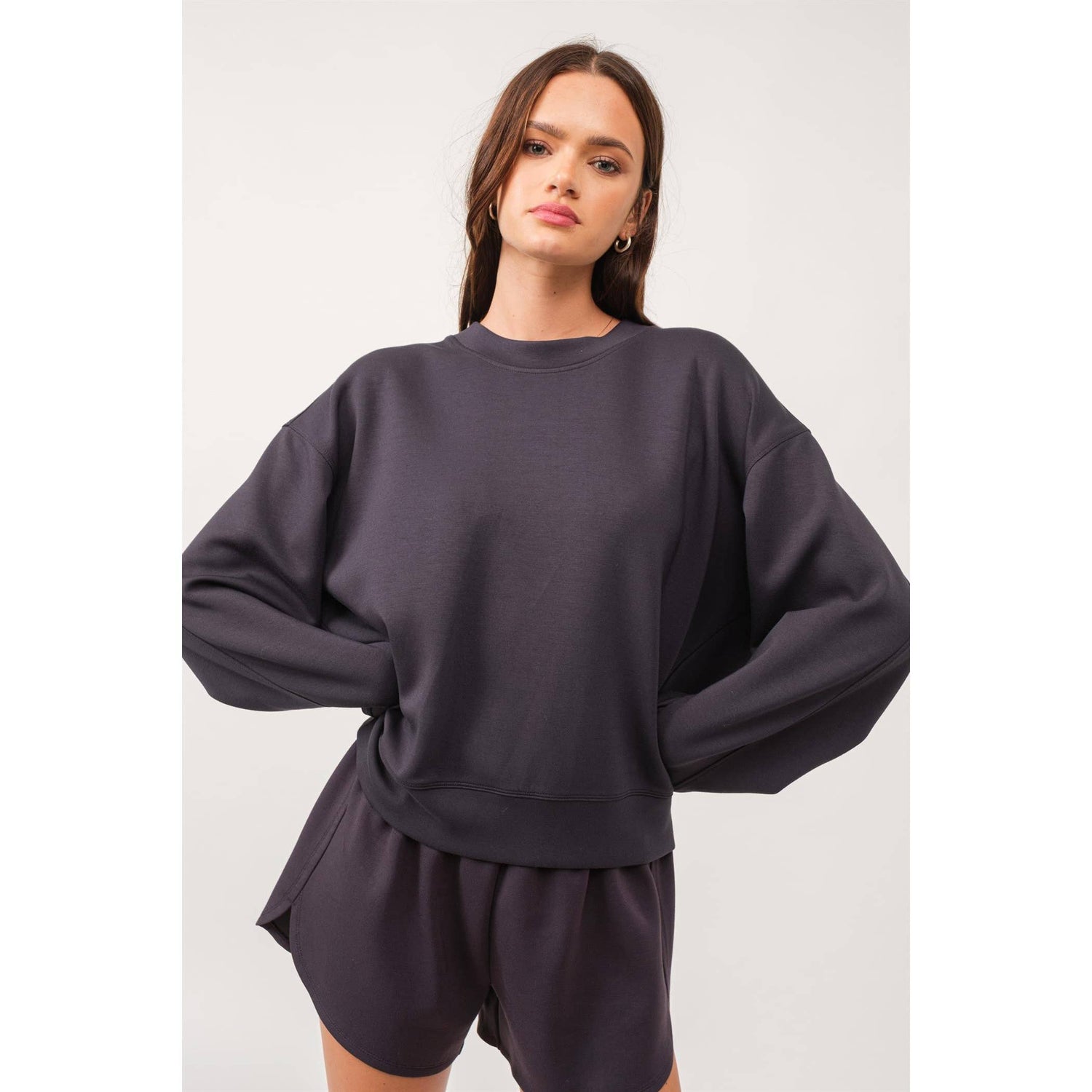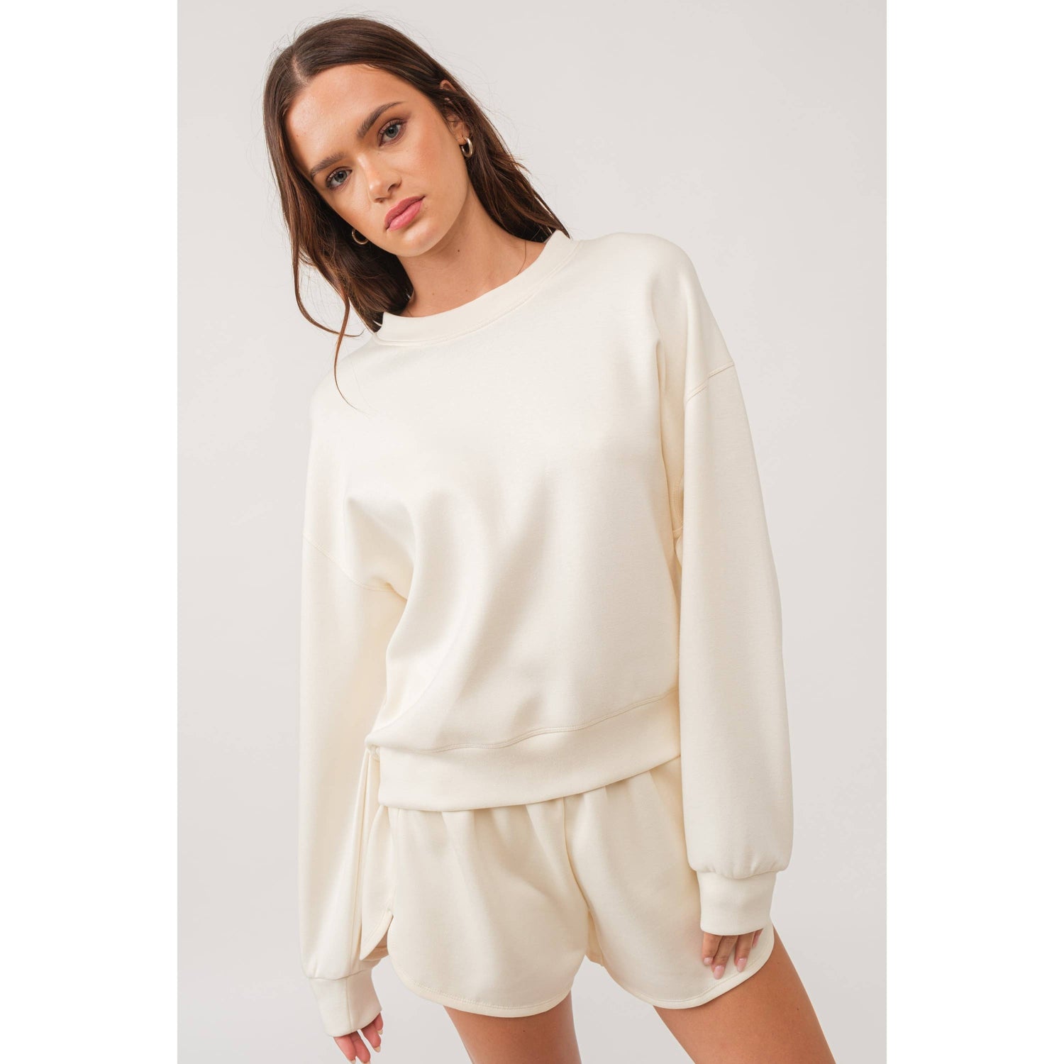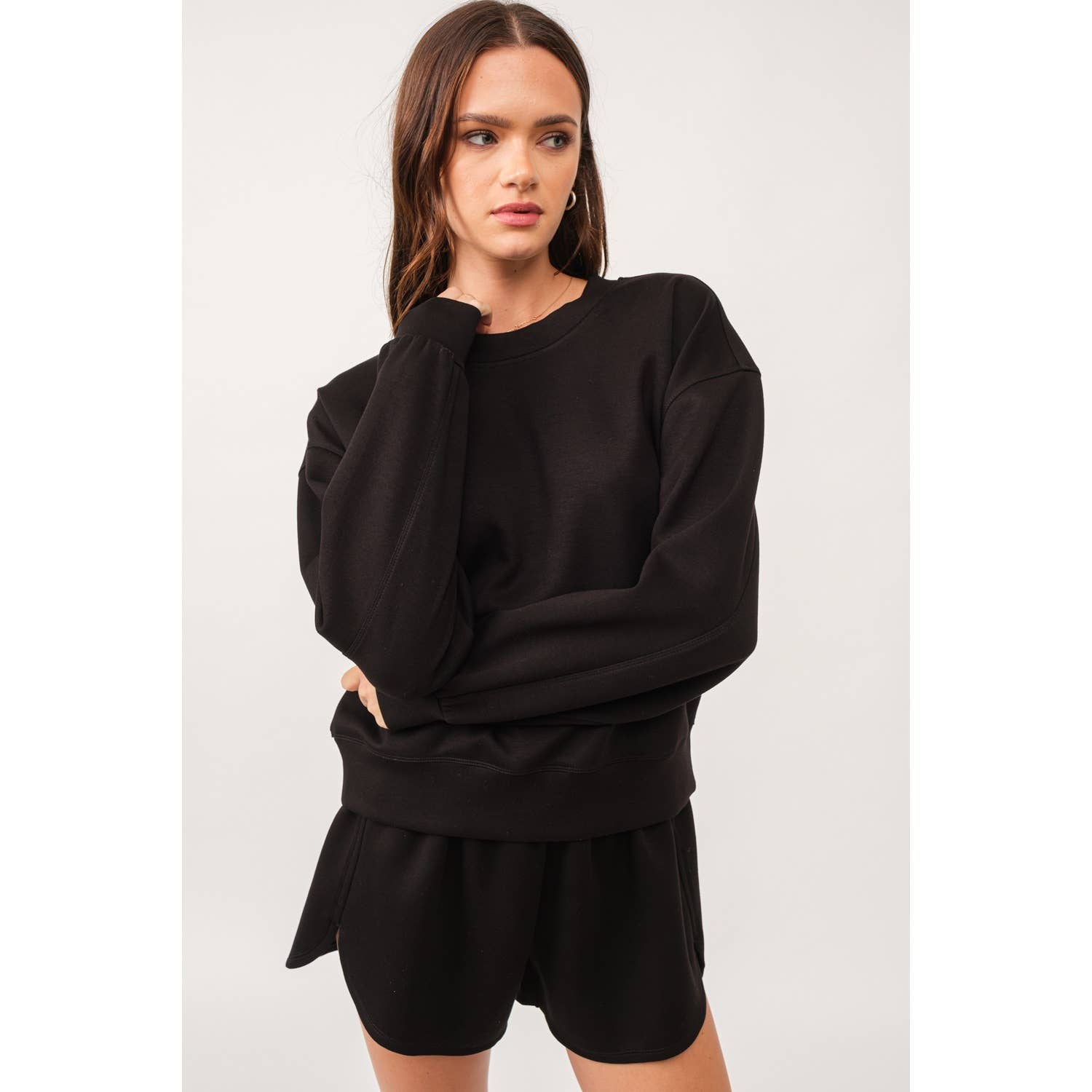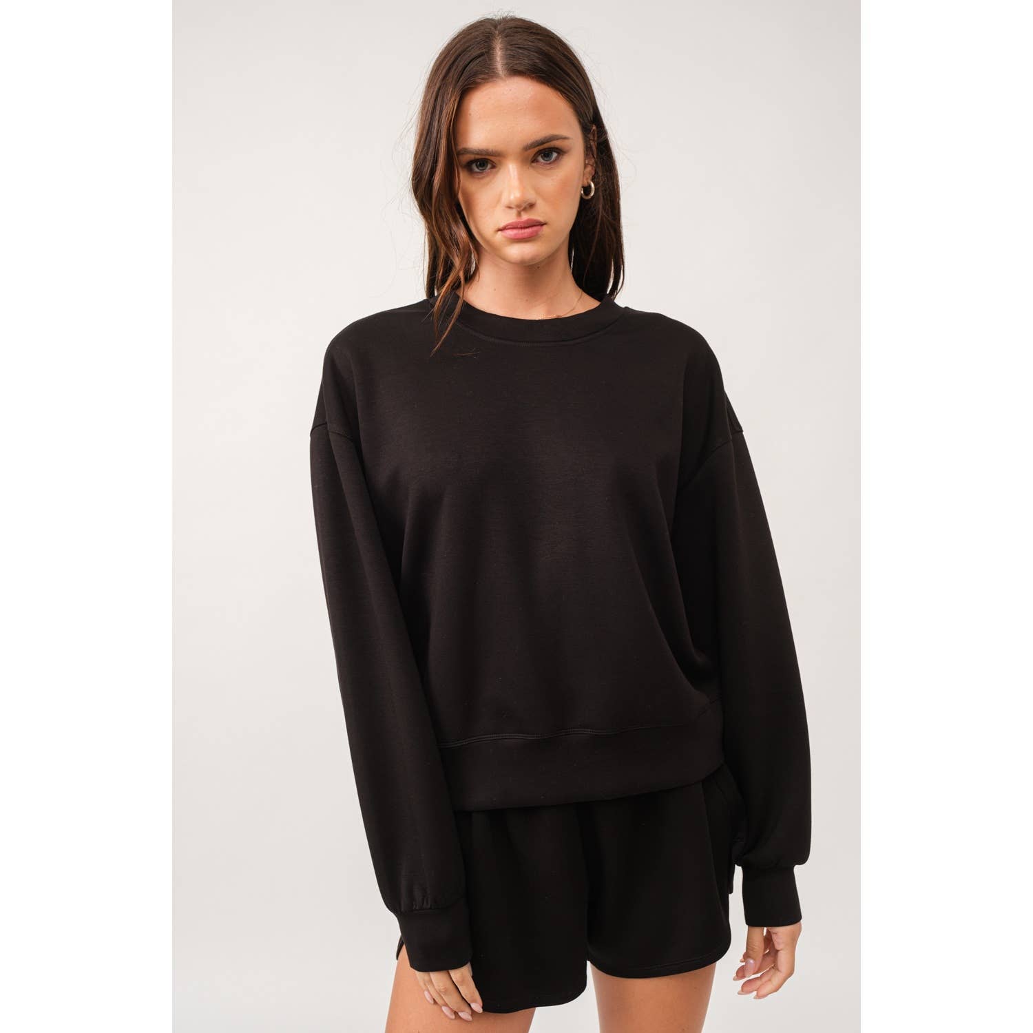 You can be confidently comfortable in our signature soft sweatshirt. This is made of light-weighted premium scuba. SIZE & FIT About 23" from HPS to hem Bust, about 24" 48% rayon 46% polyester 6% spandex