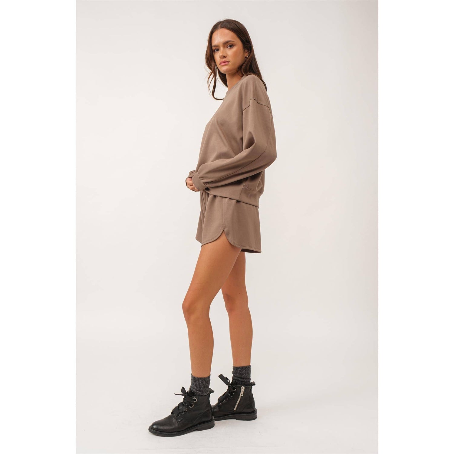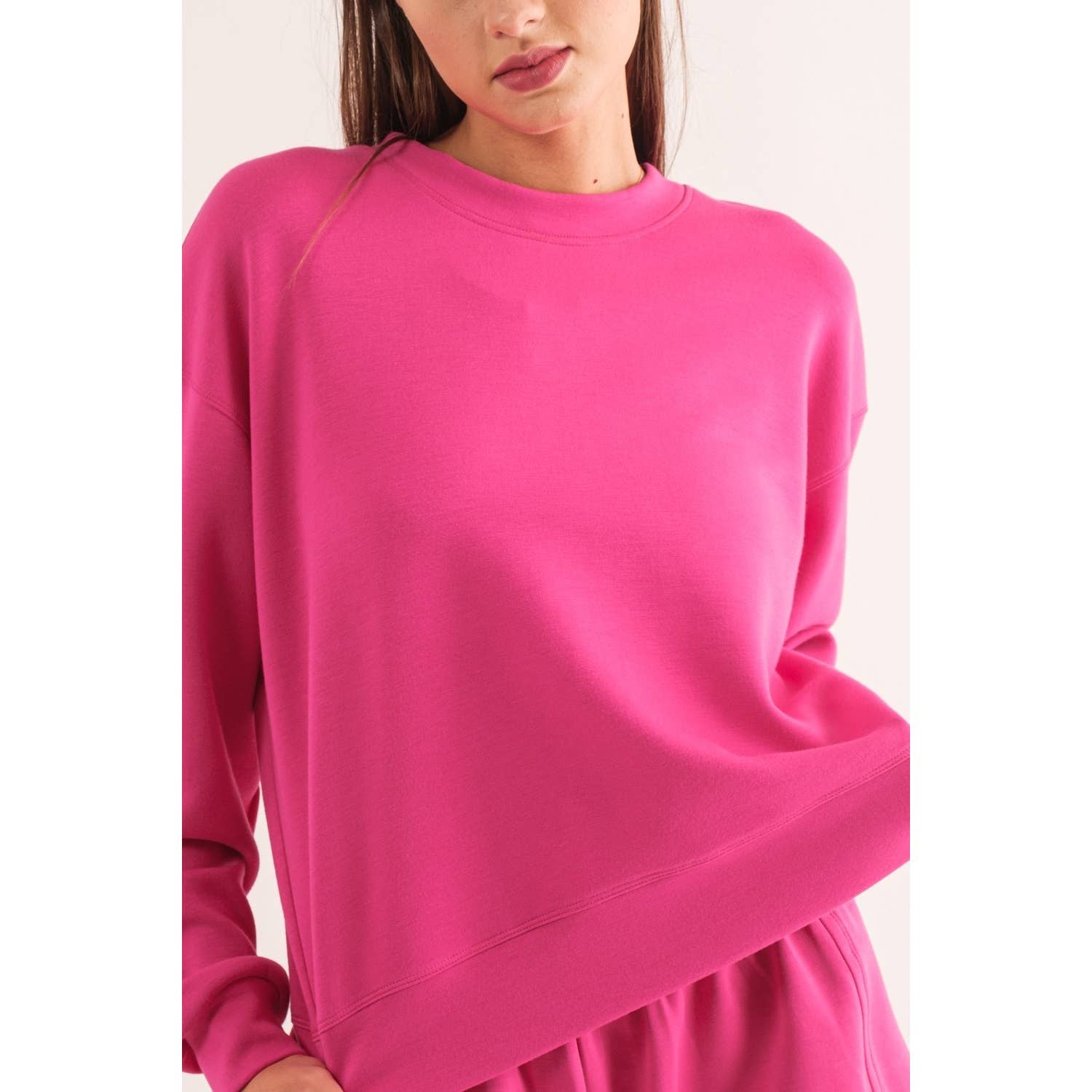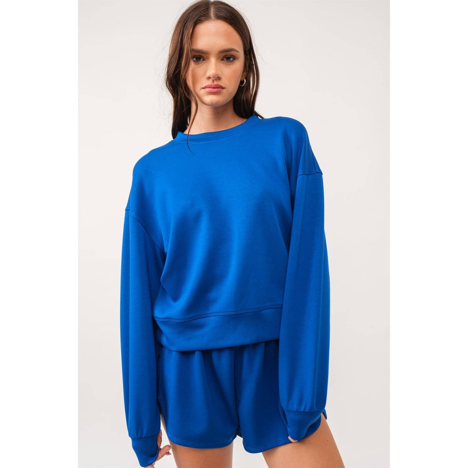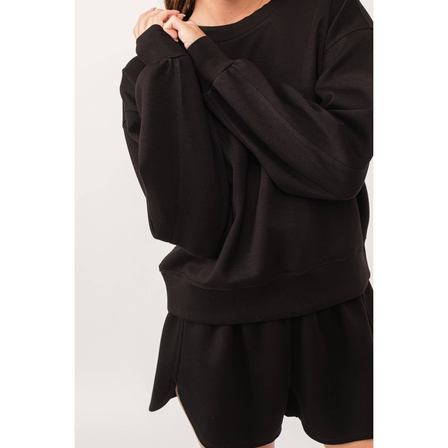 You can be confidently comfortable in our signature soft sweatshirt. This is made of light-weighted premium scuba. SIZE & FIT About 23" from HPS to hem Bust, about 24" 48% rayon 46% polyester 6% spandex